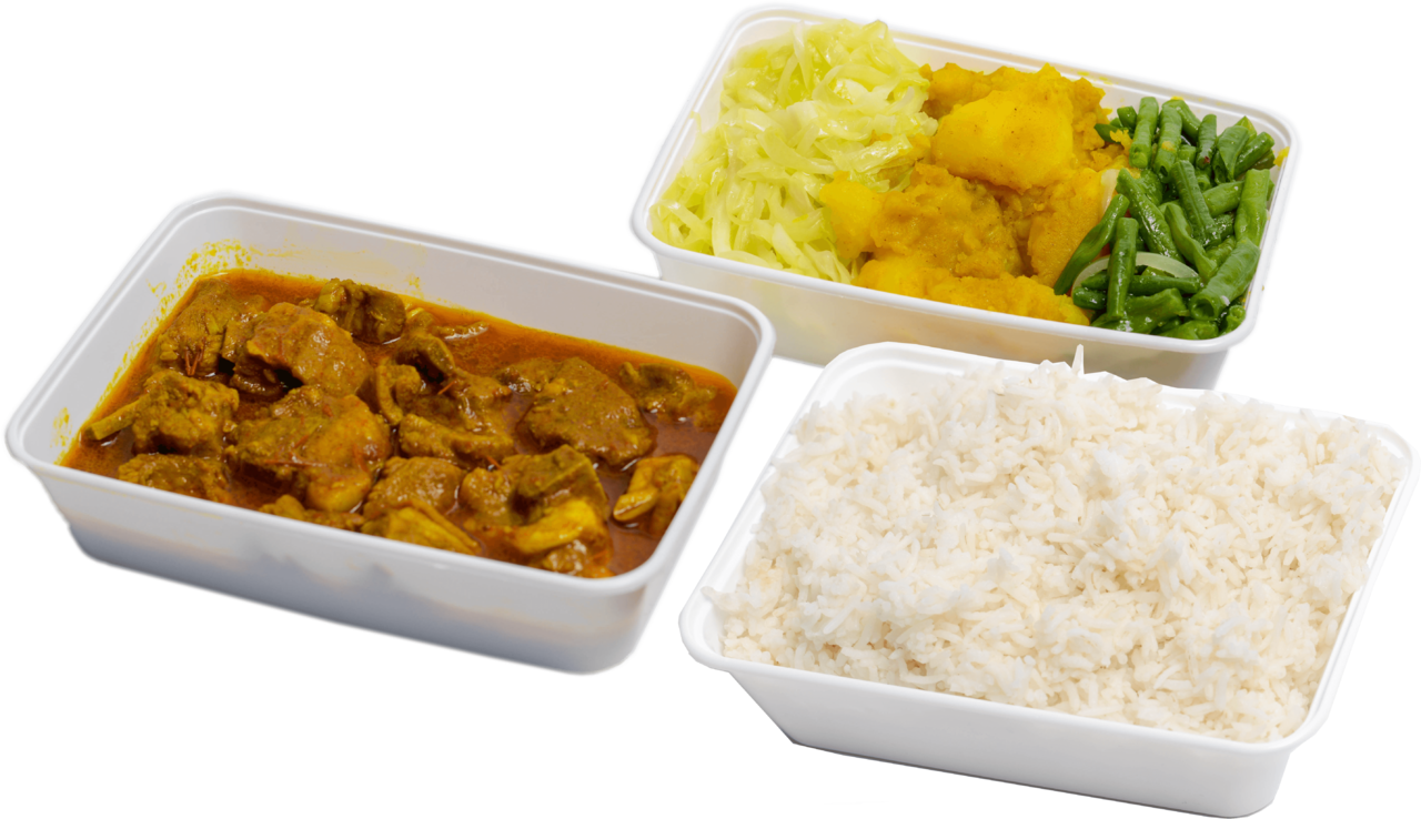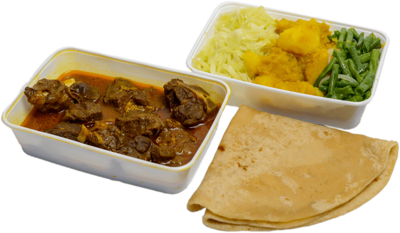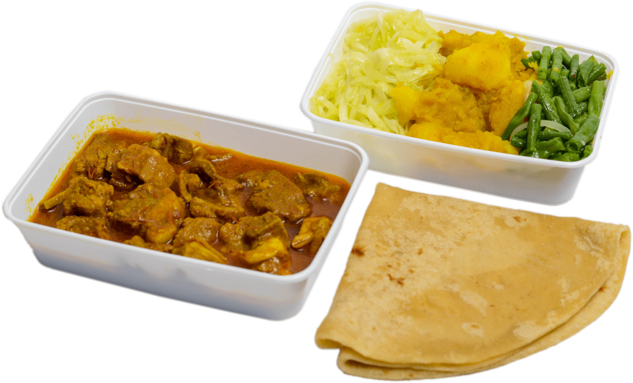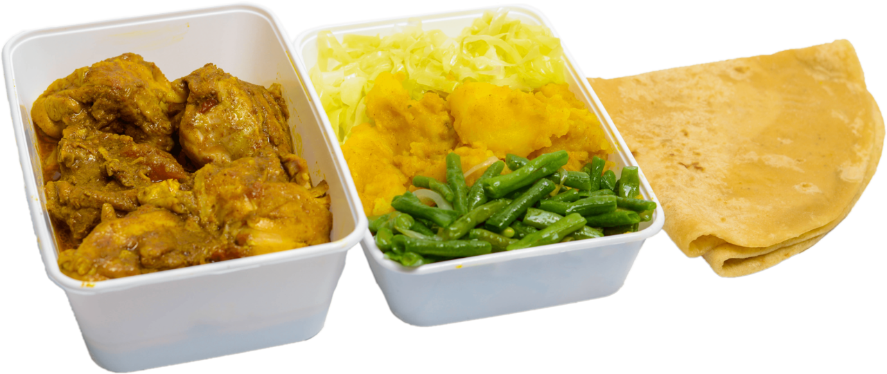 Keuze uit: Kippenpoten in kerrie, Doksa, Geit, Lams, Gestoofde kip ketjap, Kipfilet in kerrie en meer.